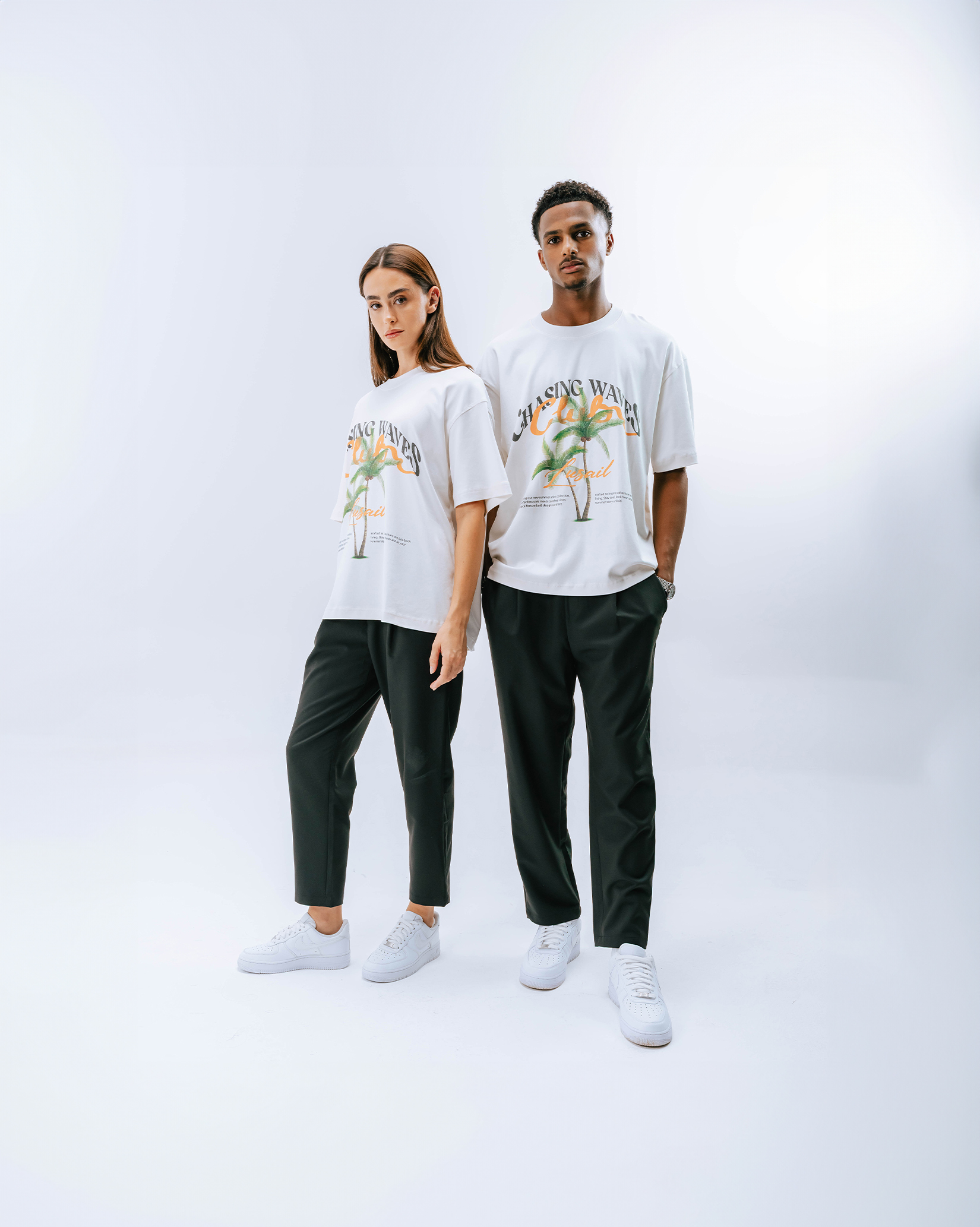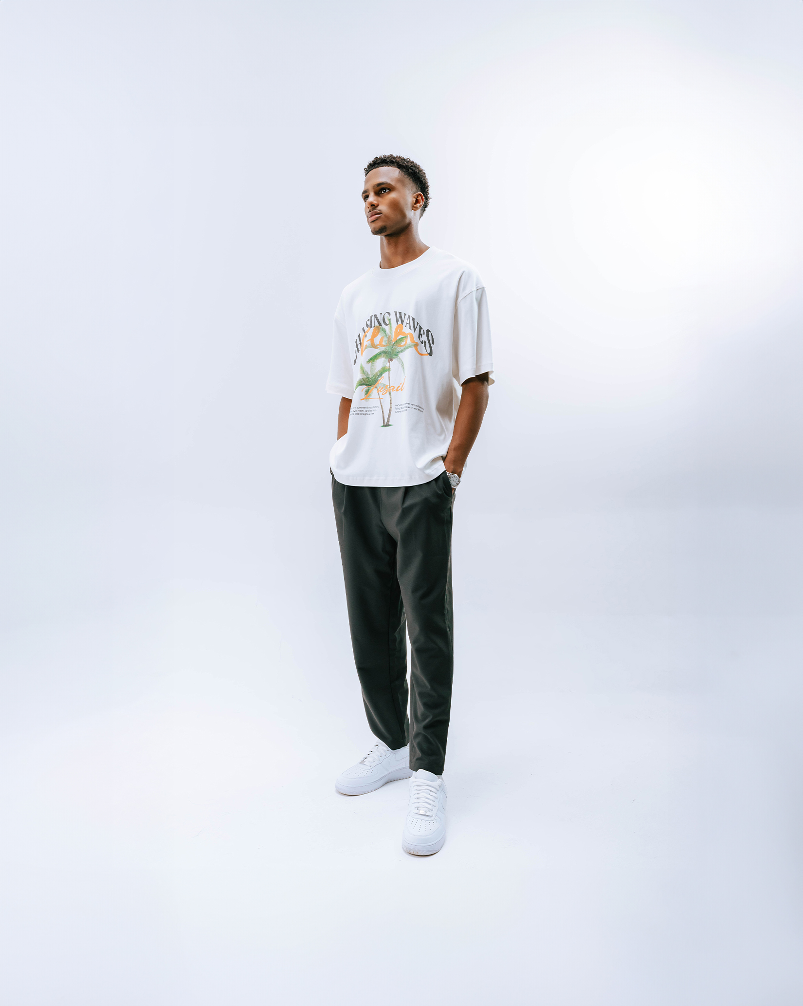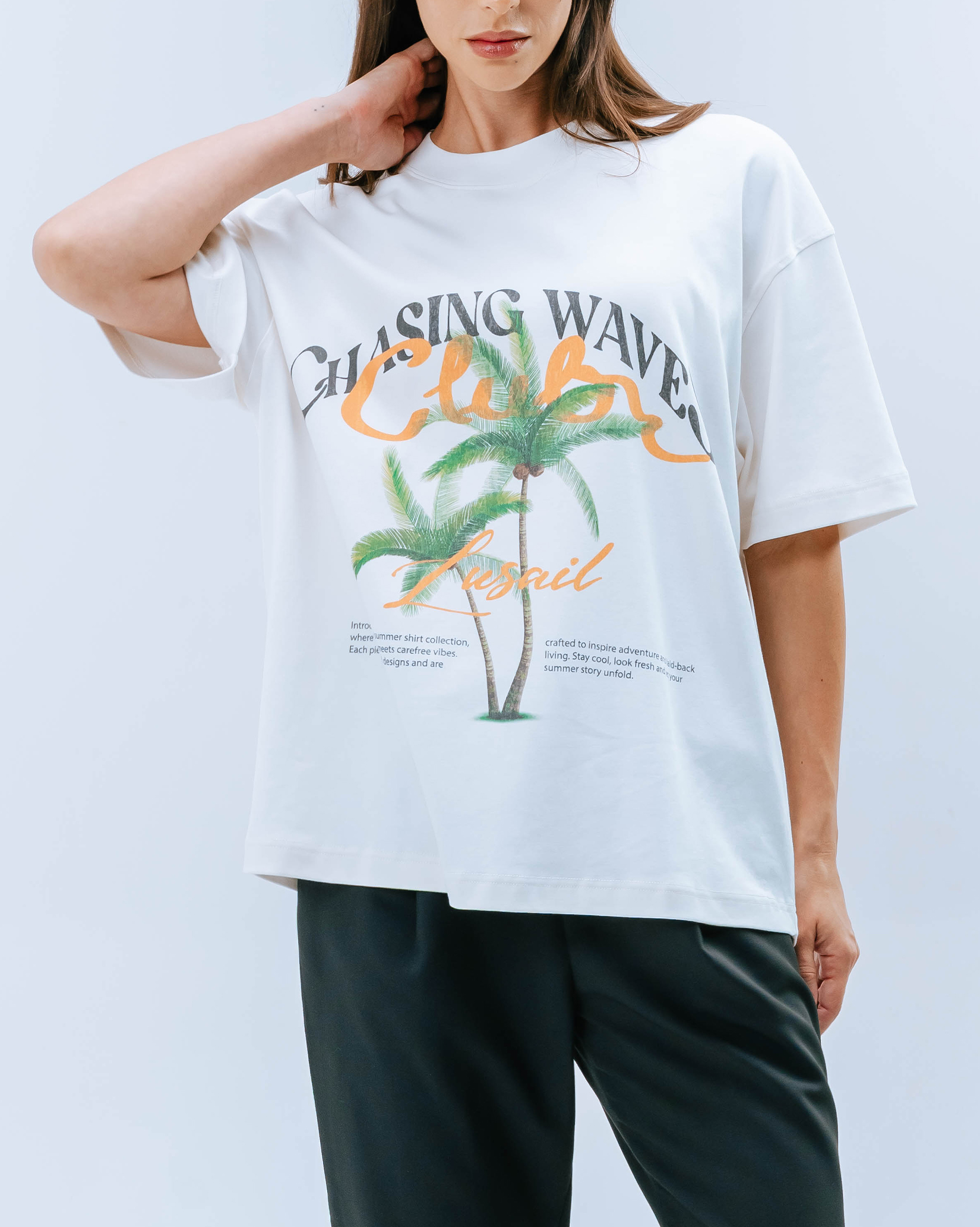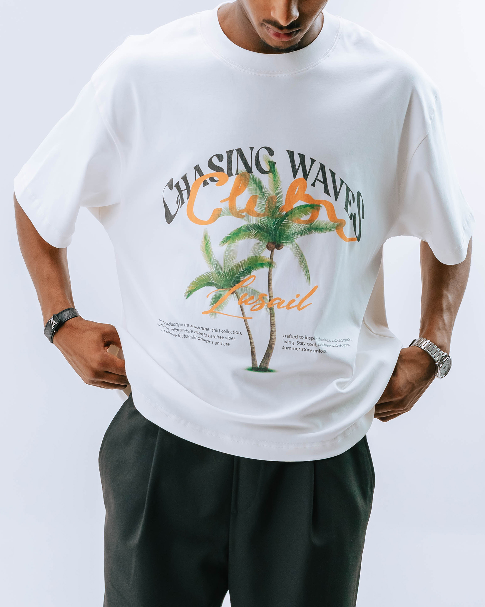 - Graphic palm print with “Chasing Waves Club Lusail” artwork